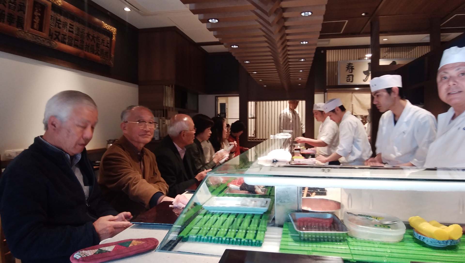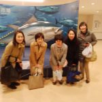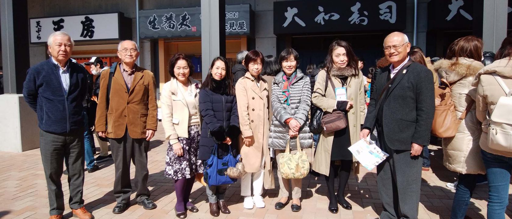 午後は、混雑する管理棟をすりぬけ、7街区の水産卸売場棟へ向かいました。途中のホールにあったマグロのオブジェの大きさに驚き、2階の専用デッキからマグロのセリ場を見学しました。 豊洲市場見学の締めくくりは、「やはり 買い物よ」と お土産を買いに6街区の水産仲卸売場棟へ。3階の物販店舗「魚がし横町」はお店の種類が豊富で、1件1件見ていたら時のたつのを忘れ、すぐ、次の目的地の浜離宮へ移動する時間が来ました。