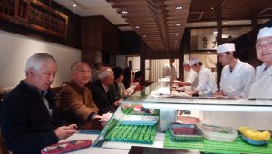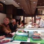 まだ、朝10時を少し回った時間でしたが、「せっかく豊洲市場に来たのだからお寿司を食べましょう」と、話がまとまり、駅からつながる歩行者デッキで、5街区青果棟前1階にある、人気店に行きました。