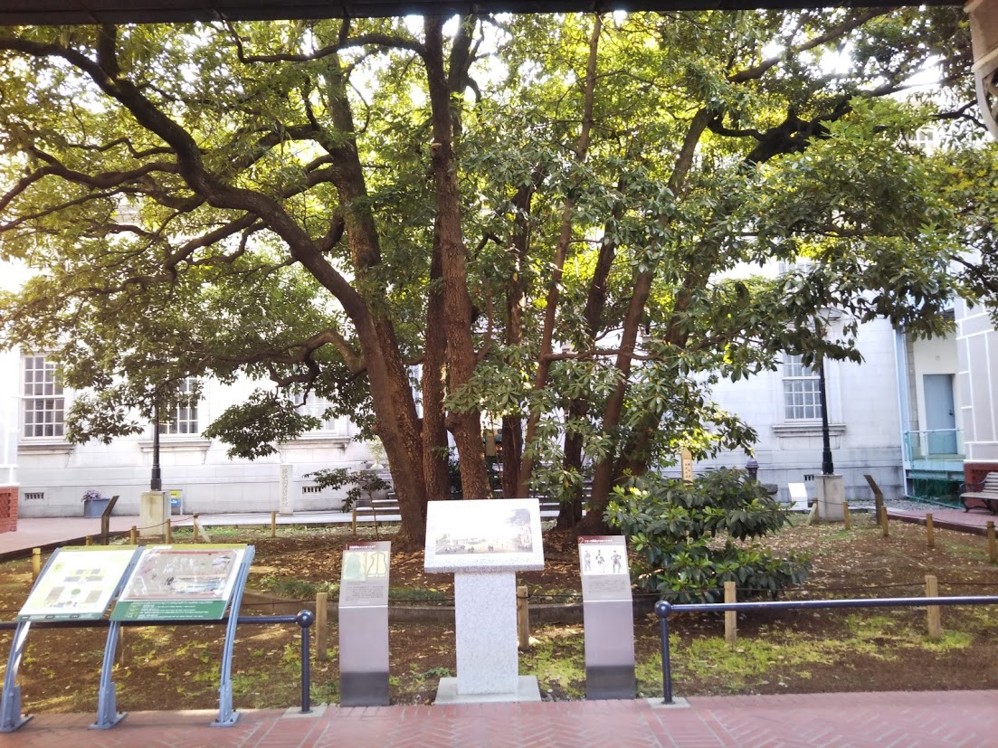 中庭に植えられているタマクスの木(ペリー来航時の記録画にも描かれている)を見て、浮世絵にも描かれた象の鼻を見学。