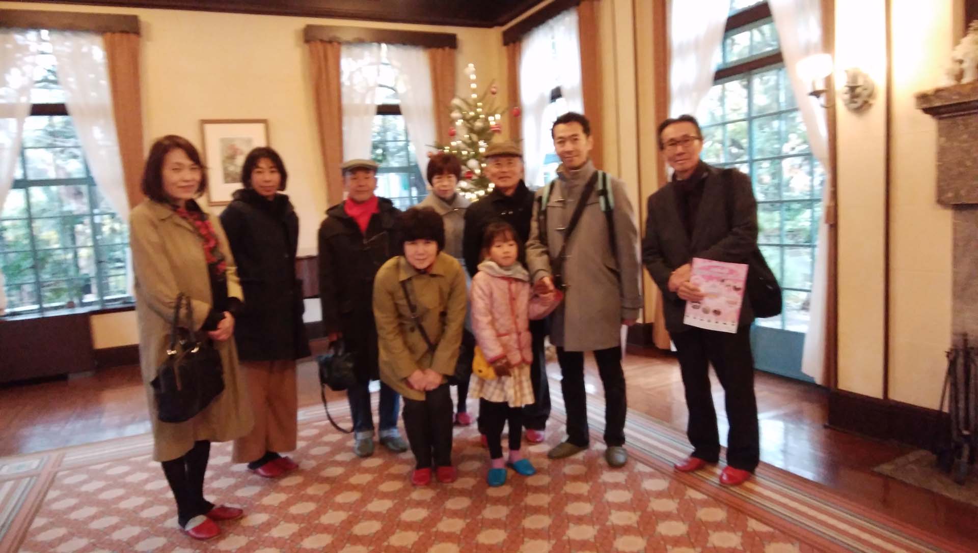 横浜山手聖公会の教会内を拝見した後は、ベーリックホールで フランス共和国のシックなクリスマスの飾りつけをバックに記念写真を撮りました。