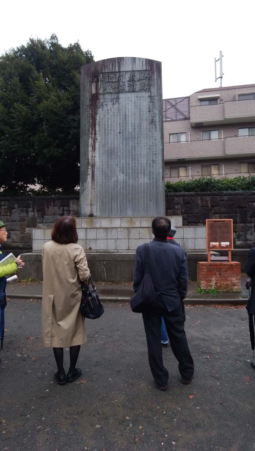 雨も上がり 北方小学校へと坂を下って、校庭脇のビール井戸を覗き込んだ後は、ケヤキ通りを歩き、キリン園公園で、麒麟麦酒開源記念碑を仰ぎ見ました。