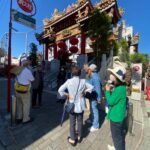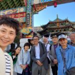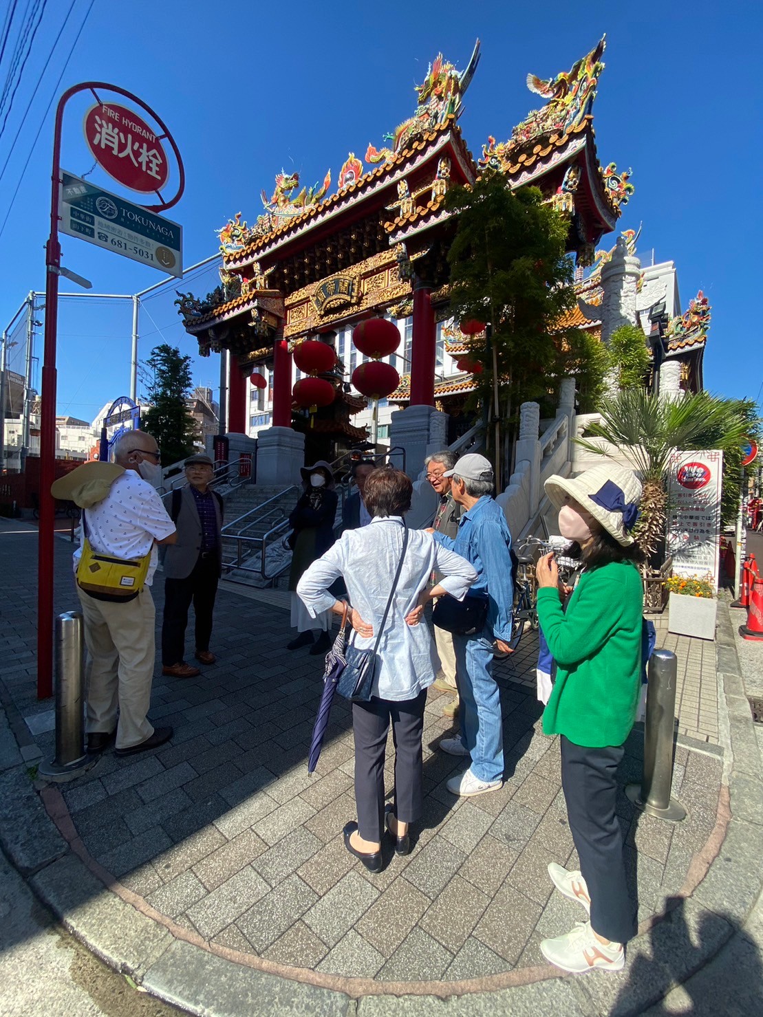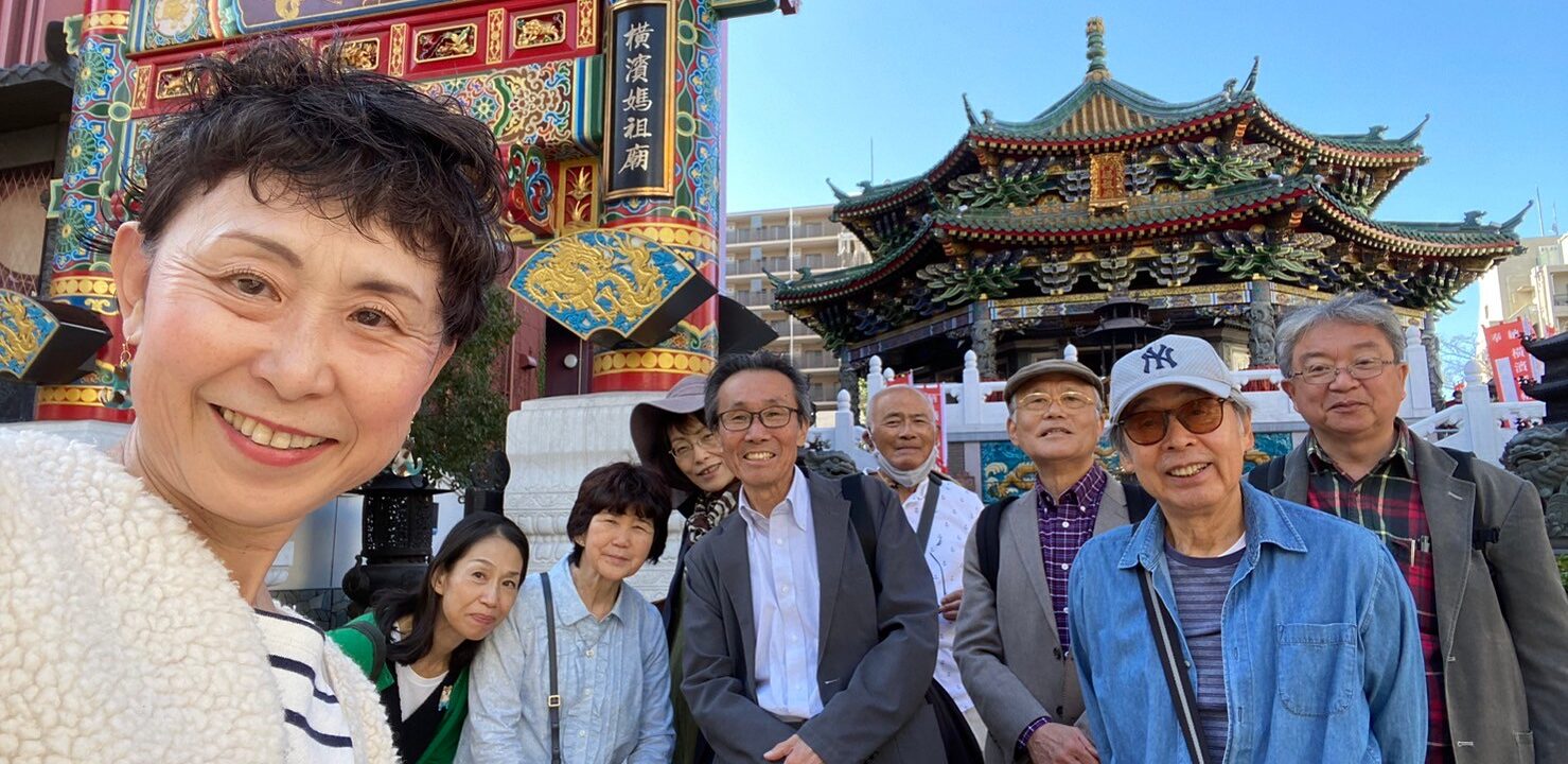 まず、まだ開店準備中の店が多い中華街の市場通りを 食べ放題メニューの看板・いちごあめ・ズラッと並ぶ北京ダック・占い店など 見たり冷やかしたりして通り抜け、パワースポットの一つ、三国志で有名な将軍の関聖帝君を祀る関帝廟へ。廟をバックに階段で 集合写真を撮った後は、関帝廟通りを ぶらぶらとショッピングし、次のパワースポットの横濱媽祖廟へ。慈愛に満ちた海の女神をお参りしていたら、ちょうどランチの始まる時間になりました。