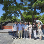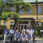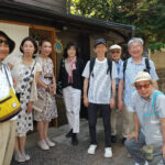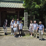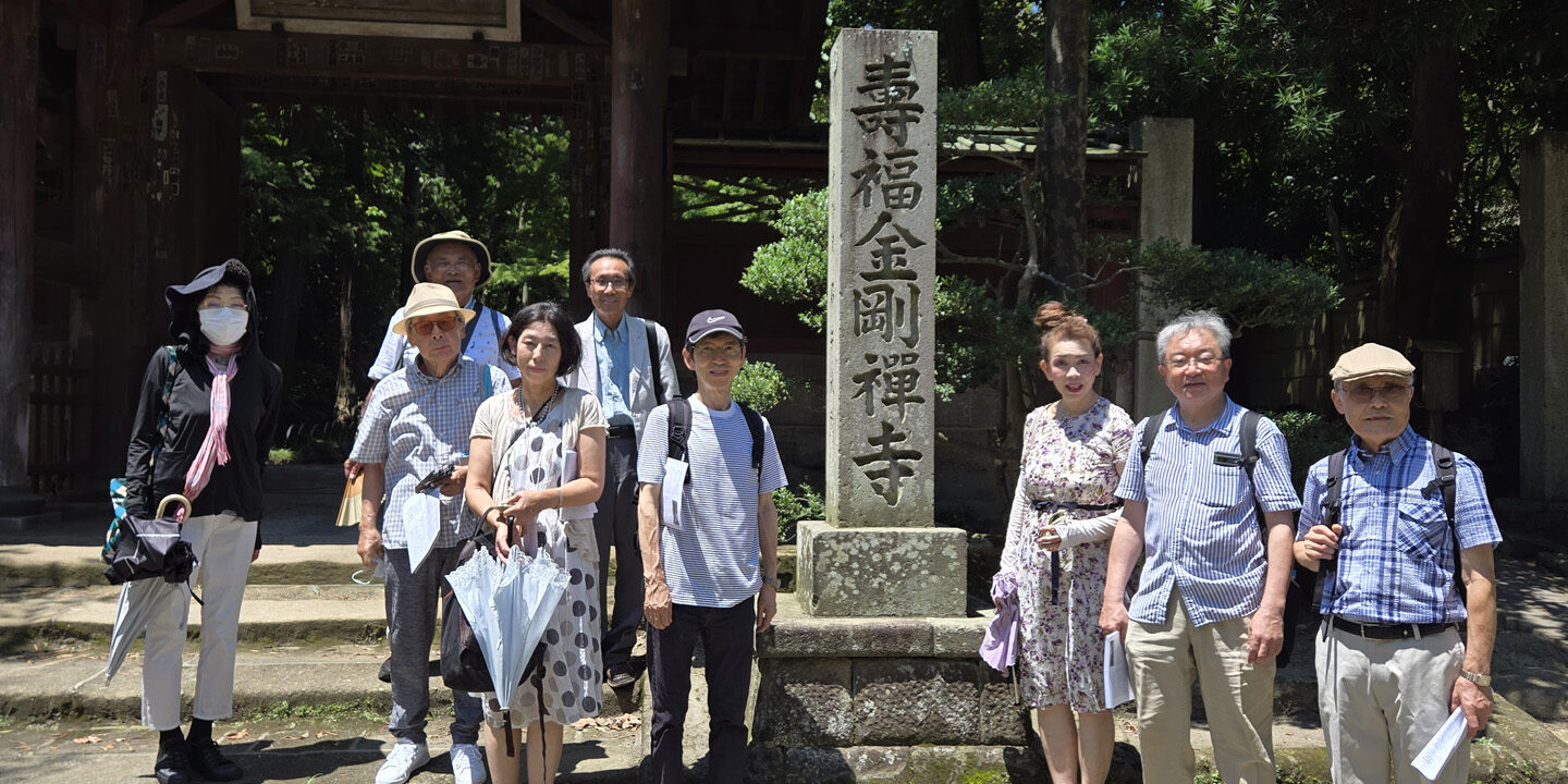しかし中山さんの熱意に促され、太陽が照り付ける小町通りに出て「鉄ノ井」に足を止め、八幡宮の鳥居に行き、集合写真を撮り、鎌倉彫の老舗店に入る。店内の見学後、源平池の蓮の花や銀杏の御神木を見て、元気な人は大石段を上り、鶴岡八幡宮に詣でる。流鏑馬馬場を抜け、付属小学校の脇道から幕府跡へと向かうが、強い日差しに負け、古民家イタリアンで休憩。スパークリングワインなどで喉を潤すと予定の半分も来ていないのに既に2:30過ぎ。だがアルコールで元気が出たのか?次々と階段を上り、緑の深い頼朝の墓、草深い山の中の大江広元の墓、絵柄天神と巡り、鎌倉宮に着くと7月23日はなんと護良親王祭。巫女の吹く法螺貝の音に感動し気を取り直し、最後の永福寺跡へ。