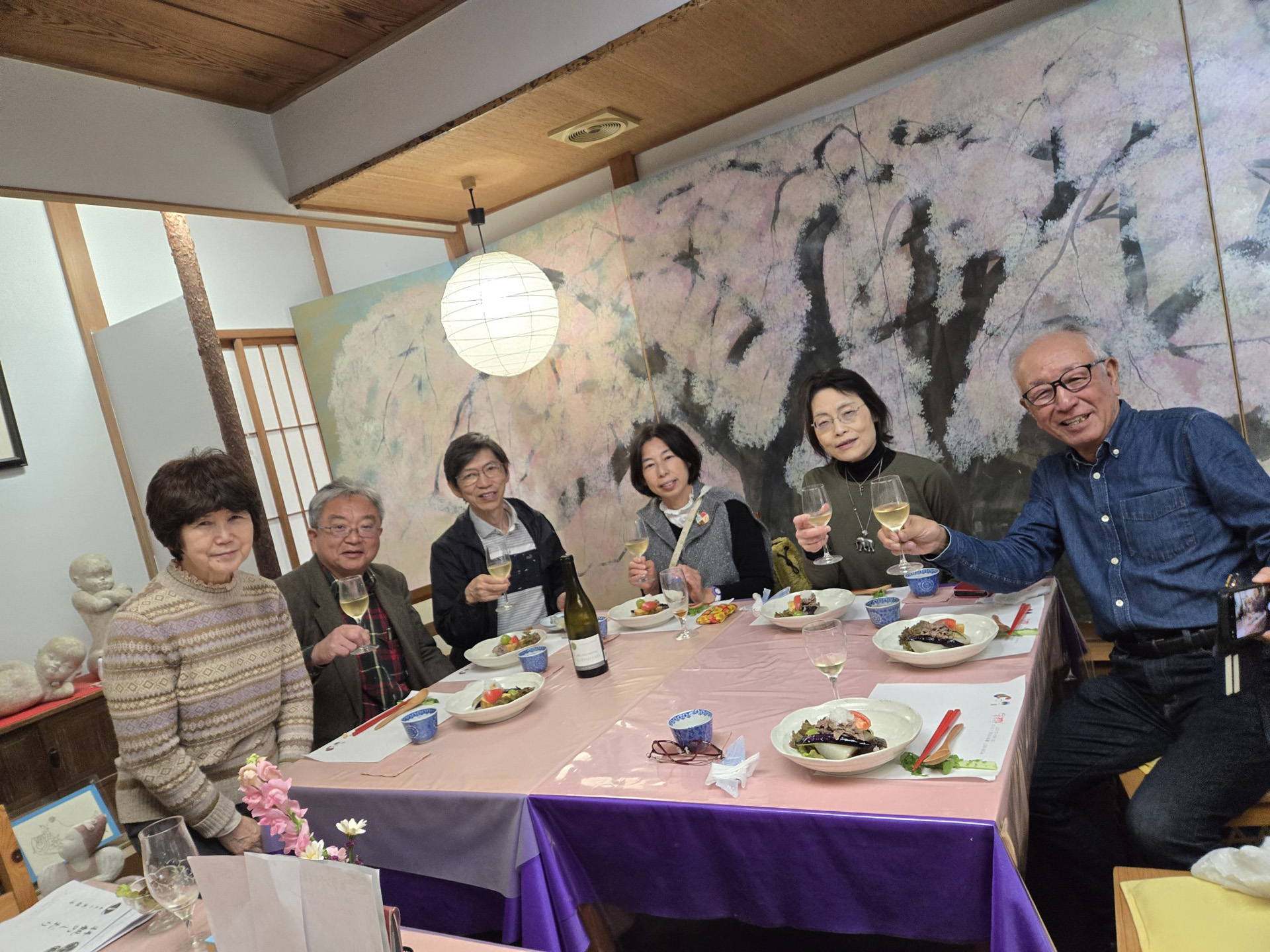 そろそろお腹もすいた頃となり、市役所前通りのトンネルを抜け佐助にある古民家レストラン「福来鳥」に。前菜からデザートのケーキやクッキーまで大根づくしの身体に優しいランチをワインと一緒に堪能。