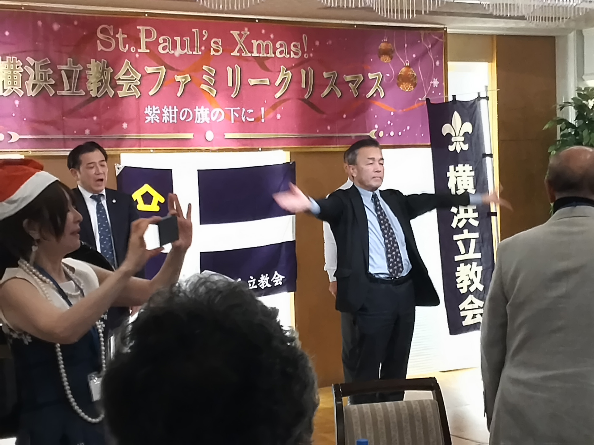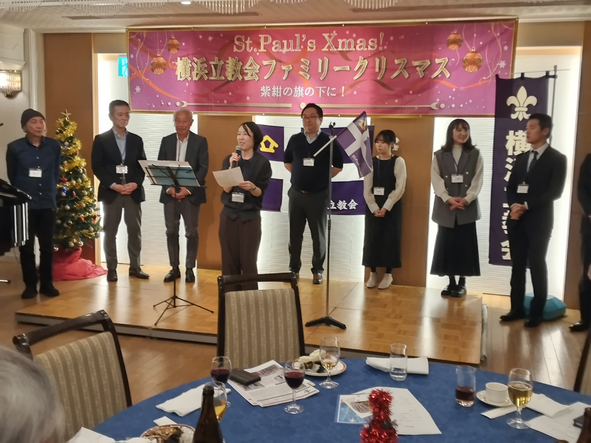 12月17日(火)、横浜立教会クリスマス会が港の見える丘公園のKKRポートヒル横浜を会場に、19時から盛大に開催されました。当日の参加者は50名。近くのアメリカ山公園はブルーに染めたウインターイルミネーションで飾られ、この時期にふさわしい夜景でした。