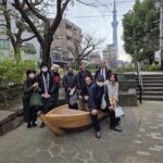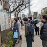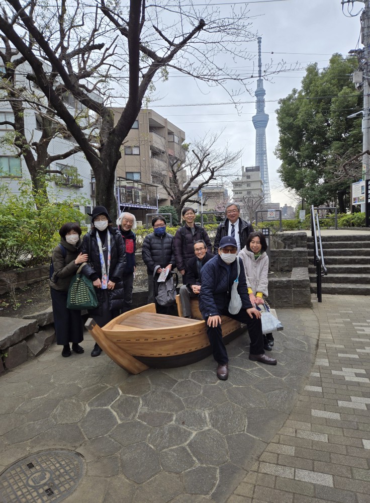 4リバーサイドスポーツセンターで1回目の下車。最初の見学地、待乳山聖天は ちょっと小高い森の中にありミニゴンドラに乗って行きました。お願い事をすませて階段を下りバス通りに出て 江戸時代は猪牙舟で吉原に通う水路を埋め立てた山谷堀公園では スカイツリーをバックに写真を撮ったり、案内図を読んだり、スマホのナビを頼りにして、蔦重の菩提寺の正法寺(大きなビルの中)や 招き猫が縁結びを叶える今戸神社を探し 先ほど下車したバス停4に戻りました。