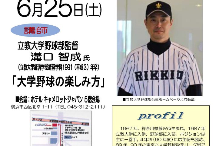 拝啓 新緑の候、皆様お元気でお過ごしのことと存じます。 さて今年も新年度を迎えるにあたり「交流の集い」を開催させていただきます。 今年は、総会に先立ちまして、現立教大学野球部監督 溝口智成氏(H3年経営学科卒)の公開講座 続きを読む …