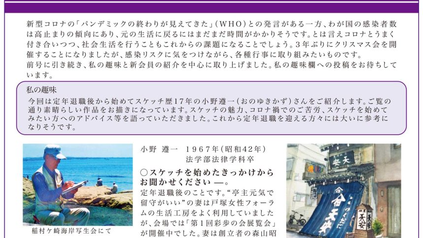 昨年は「70周年記念誌」を発行しましたが、おかげをもちまして大変好評でした。 これを受けて、コロナ禍で各種イベントの開催等が制約される中、この度会員の交流の一助として会報を発行することにしました。 当面年2回、春と秋に発 続きを読む …