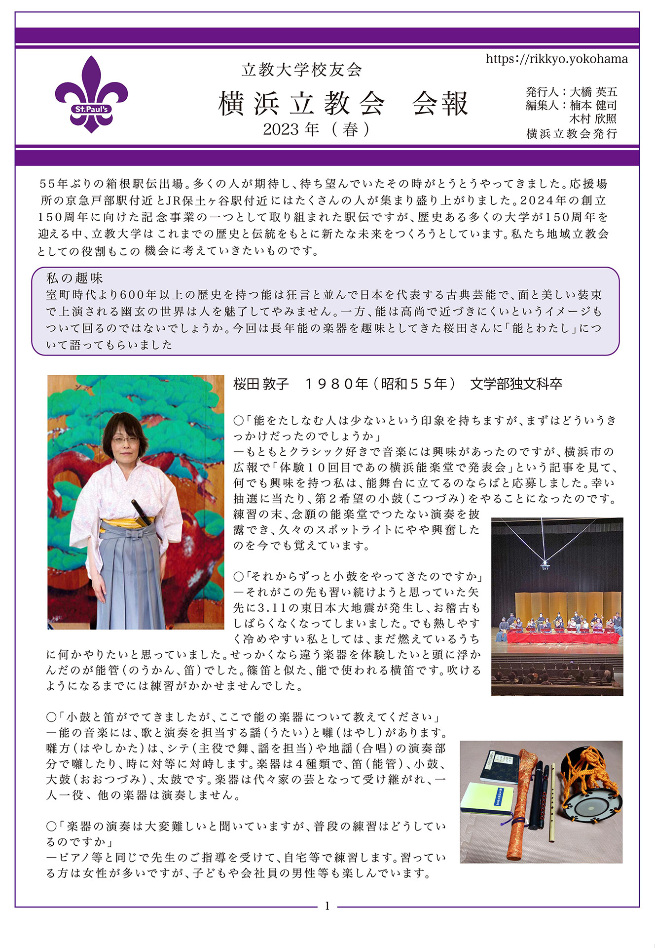 News:2023年度 東京六大学野球 春季リーグ戦 応援ツアー ~4月13日(土) 対 早稲田大学戦~ 2024/03/252024/03/25 皆様の参加をお待ちしております。初めての方、大歓迎です。 横… 続きを読む 箱根駅伝 沿道応援に行ってまいりました 2024/01/12 新春の箱根駅伝、昨年55年ぶりの出場となった立教大学陸上部、… 続きを読む 新春の箱根駅伝を応援しよう‼ 2023/12/22 2024年、横浜立教会のスタートは「第100回箱根駅伝応援」… 続きを読む 恒例のクリスマス会に多数が参加 2023/12/22 クリスマス会が12月14日(木)夜、馬車道に近いイタリアレス… 続きを読む 第23回「歩こう会」報告:「あかいくつ」号に乗って中華街に行って来ました 2023/11/27 11月8日(水)は立冬。穏やかな青空が広がる行楽日和でした。… 続きを読む 会報(秋号)を発行しました【横浜立教会 会報 2023年 秋号】 2023/11/24 コロナも一段落し、ようやく活動も軌道に乗りつつあります。今号… 続きを読む 横浜立教会クリスマス会のご案内 2023/11/15 恒例のクリスマス会を次のとおり開催します。 ワインと料理が定… 続きを読む オープンマーケット出店 焼き鳥完売! 2023/10/20 10月15日(日)の第61回ホームカミングデーはあいにくの大… 続きを読む 東京六大学野球秋季リーグ戦応援ツアー 2023/09/19 東京六大学野球秋季リーグ戦が開幕し、母校を応援すべく9月10… 続きを読む BBQ大会盛大に開催される 2023/09/07 横浜立教会青年部・女子会主催によるBBQ大会が、8月26日(… 続きを読む 関東大震災展を生き証人の博物館でーぶらり博物館・美術館 2023/09/07 県内の各地でも火災、津波、土石流をともなう大災害となった関東… 続きを読む <聴く会>落語を聴く会へのお誘い 2023/09/04 横浜、野毛「にぎわい座」で落語を聴きませんか?無料のご招待券… 続きを読む 「青年部・女子会BBQ大会」開催時間の変更について 2023/08/18 8月26日(日)開催のBBQ大会の開催時間が変更になりました… 続きを読む 東京六大学野球 秋季リーグ戦 応援ツアー ~9月10日(日) 対 慶応大学戦~ 2023/08/16 皆様の参加をお待ちしております。初めての方、大歓迎です。 横… 続きを読む 2023年秋の第23回「歩こう会」へのお誘い ~「あかいくつ」号に乗って中華街に行こう~ 2023/08/16 ※ 画像は「第21回 歩こう会」実施時のものです。 桜木町駅… 続きを読む 横浜立教会青年部・女子会BBQ大会のお知らせ 2023/08/16 夏休みの終わりに海を見ながらのバーベキューで交流を深めましょ… 続きを読む 4年ぶりに交流の集いを開催 2023/07/052023/08/16 6月24日、交流の集いを横浜駅西口のホテルプラムで開催し、約… 続きを読む <ぶらり博物館・美術館>神奈川県立歴史博物館特別展「関東大震災―原点は100年前―」 2023/07/05 関東大震災は、震源域のただ中に位置した神奈川県域に甚大な被害… 続きを読む 会報(春号)を発行しました【横浜立教会 会報 2023年 春号】 2023/06/08 横浜立教会会報(2023年春号)を発行しました。駅伝の出場が… 続きを読む 東京六大学野球 春季リーグ戦 応援ツアー ~4月16日(日) 対 法政大学戦 2023/03/29 皆様の参加をお待ちしております。初めての方、大歓迎です。 横… 続きを読む 共有:Tweet